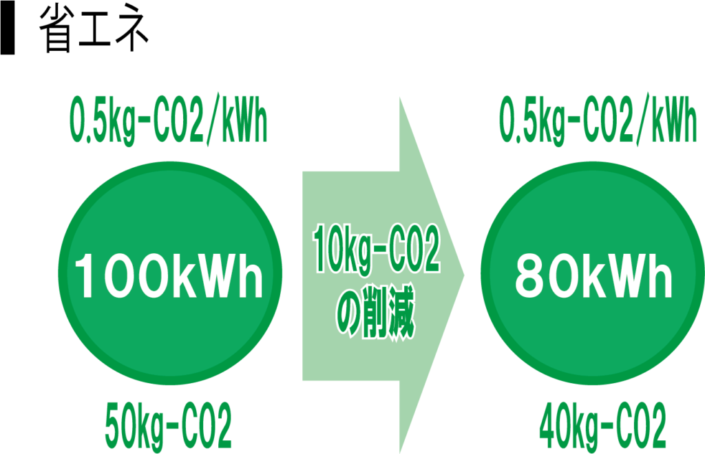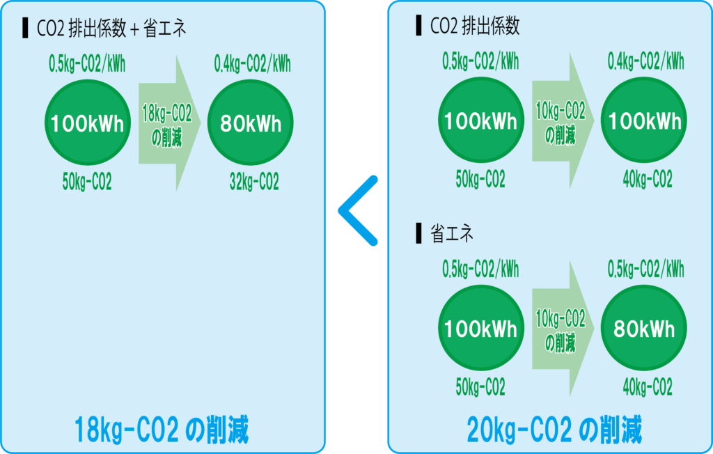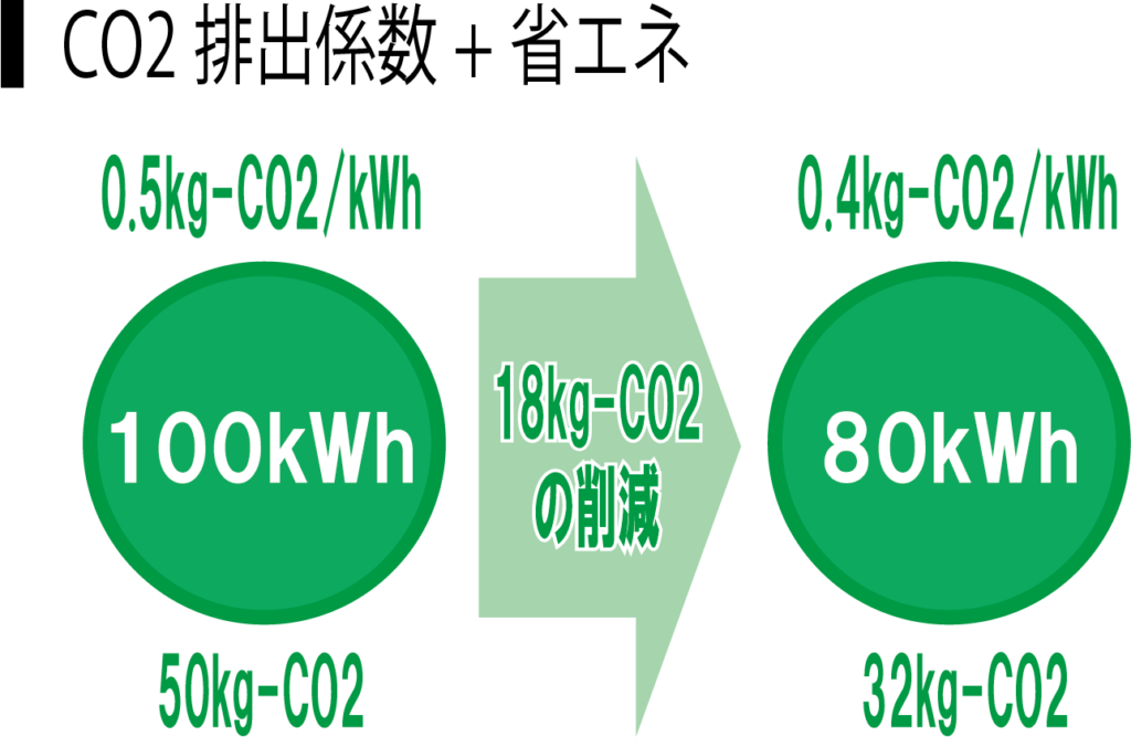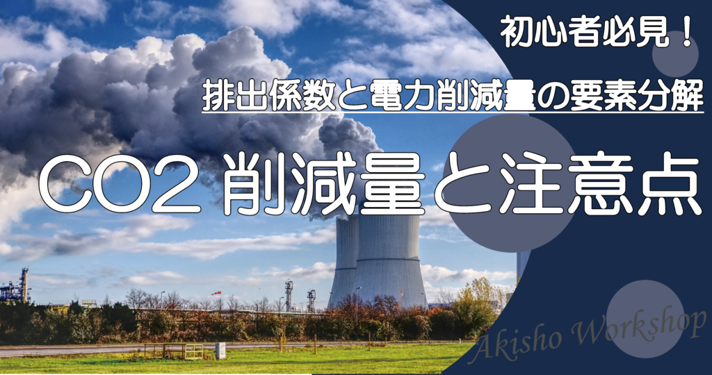 ホーム > 機械設備一般 CO2削減量要素分解時の注意点 -CO2排出係数と省エネ効果- 2025.10.03 こんにちは。2050年までにカーボンニュートラルが求められており、建物の脱炭素化にむけて、各年度のCO2排出量を管理している事業者は少なくない。各年度のCO2排出量を算定するためには、電気やガスなどの光熱費を積み上げることとなる。積み上げた情報を基にCO2排出量を毎年比較すると、CO2排出量の増減が確認できる。そのCO2排出量の増減の要因としては省エネ効果や使用量の削減のほか、CO2排出係数が挙げられる。CO2排出量の増減の分析にあたってCO2排出係数によるCO2排出量の増減とその他の要因によるCO2排出量の増減の分別が難しい。今回はCO2削減量のうち、CO2排出係数と省エネ効果の要素分解のパターンについて紹介する。 コンテンツ CO2排出係数の概要CO2排出係数とはCO2排出係数の性質電力のCO2排出係数の推移CO2排出量と削減効果の要因大きな枠組みで見るCO2削減量CO2排出係数のみ変動した場合のCO2削減量電力量のみ変動した場合のCO2削減量排出係数と省エネで重複するCO2削減量全体のCO2削減量を整合させるために(参考)細かな方法については環境省等では公開されていないまとめ CO2排出係数の概要 CO2排出係数とは CO2排出係数とは、ある燃料や電気を1単位(例:1kWh、1L、1㎥など)使用したときに排出される二酸化炭素の量を示す係数のことである。一般的に単位は「kg-CO2/燃料の単位」で示される。 CO2排出係数 用語の意味 CO2排出係数とは、ある燃料や電気を1単位(例:1kWh、1L、1㎥など)使用したときに排出される二酸化炭素の量を示す係数のこと。 単位 kg-CO2/燃料の単位 CO2排出係数の性質 ガスや油などは燃焼により熱を発生させているため、CO2排出係数は一定である。 一方で、火力発電所による化石燃料や、原子力発電所などから電気が作られているため、電力会社および年度によりCO2排出係数が変動する性質がある。 例えば太陽光発電の場合は物質を燃焼させて電気を生み出しているわけではなく、自然由来の太陽光より電気を発生させているため、CO2排出係数はゼロとなる。 (太陽光発電そのものの製造や破棄などにより厳密にはCO2が排出されている。) CO2排出係数の性質ガスや油CO2排出係数は一定電気電力会社や年度により異なる 電力のCO2排出係数の推移 2013年度から2022年度までの各電力会社のCO2排出係数推移を下図に示す。関西電力のCO2排出係数が比較的小さく、沖縄電力のCO2排出量が大きいことがわかる。また、2013年度と2022年度のCO2排出係数を比較すると、いずれの電力会社もCO2排出係数が低下している。詳細はこちらの記事より参照いただければと思う。 CO2排出量の算定方法 -建物からのCO2排出量算定ツールも紹介-こんにちは。近年、建物の脱炭素化がより積極的に図られることもあり、建物からのCO2排出量を算定することが多々ある。そのため、建物の消費電力量やガス使用量からCO2排出量を求める必要がある。しかし、普段からCO2排出量の算定していないと算定方... CO2排出量と削減効果の要因 大きな枠組みで見るCO2削減量 各年度のCO2排出量を見比べる場合、一般的には左図に示すとおり、全体のCO2排出量のみを比較し削減量を確認することとなる。左図の例でいえば、CO2削減前が0.5kg-CO2/kWhに100kWhを乗じて50kg-CO2であることに対し、CO2削減後が0.4kg-CO2/kWhに80kWhを乗じて32kg-CO2となる。結果、18kg-CO2の削減となる。 CO2排出係数のみ変動した場合のCO2削減量 先ほどの例を要素分解する。具体的にはCO2排出係数のみ変動した場合におけるCO2削減量を確認する。CO2削減前が0.5kg-CO2/kWhに100kWhを乗じて50kg-CO2であることに対し、CO2削減後が0.4kg-CO2/kWhに100kWhを乗じて40kg-CO2となる。結果、10kg-CO2の削減となる。 電力量のみ変動した場合のCO2削減量 次に電力量のCO2削減量のみを抽出する。CO2削減前が0.5kg-CO2/kWhに100kWhを乗じて50kg-CO2であることに対し、CO2削減後が0.5kg-CO2/kWhに80kWhを乗じて40kg-CO2となる。結果、10kg-CO2の削減となる。 排出係数と省エネで重複するCO2削減量 前項で紹介した通りCO2排出係数および電力量によるCO2削減量を要素分解すると、それぞれのCO2削減量は10kg-CO2となり、合計で20kg-CO2となる。しかし、総量としてのCO2削減量は18kg-CO2である。つまり、要素分解した際に一部のCO2削減量(2kg-CO2)が重複していることとなる。 全体のCO2削減量を整合させるために CO2排出係数によるCO2削減量および電力量によるCO2削減量と全体のCO2削減量を整合させるためには、大きく三種類の方法が考えられる。一つ目はCO2排出係数によるCO2削減量を優先する方法である。全体のCO2削減量18kg-CO2のうち、CO2排出係数によるCO2削減量が10kg-CO2の場合、結果として電力量によるCO2削減量は8kg-CO2となる。二つ目は電力量によるCO2削減量を優先する方法である。全体のCO2削減量18kg-CO2のうち、電力量によるCO2削減量が10kg-CO2の場合、結果としてCO2排出係数によるCO2削減量は8kg-CO2となる。三つ目はCO2排出係数によるCO2削減量および電力量によるCO2削減量より割合で案