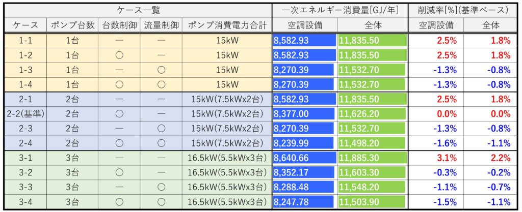 ホーム > 機械設備一般 空調二次ポンプの台数と制御による省エネ効果 2025.10.13 こんにちは。建物の省エネを図る際には、具体的にどのような施策を行えばどの程度の省エネに寄与するかがわからないことも少なくない。建物全体のエネルギー消費量としては、一般的に特に空調設備が占める割合が大きい。そのため、空調設備の省エネ施策が建物全体の省エネルギーに大きく寄与する。しかし、空調設備の省エネ施策と一口にいっても、実際には様々な手法が存在し、効果も建物の用途や使われ方によって大きく異なる。今回は空調二次ポンプの台数と制御による省エネ効果について紹介する。 コンテンツ 空調二次ポンプの概要空調二次ポンプとは空調二次ポンプの省エネケーススタディ比較検討の概要比較検討結果まとめ 空調二次ポンプの概要 空調二次ポンプとは 空調二次ポンプとは建物の中央熱源システムにおいて、熱源機器から空調機やファンコイルユニットなどの各種空調設備に冷温水を送るためのポンプを示す(図中の冷温水二次ポンプ)。 空調二次ポンプの省エネ 空調二次ポンプ省エネ手法 その1 ポンプのインバータ化 その2 ポンプの台数と台数制御 空調二次ポンプの省エネ手法としては大きくポンプのインバータ化とポンプの台数制御が挙げられる。インバータ化により、配管内の冷温水流量を制御することが可能となり、省エネ化を図ることが可能となる。また、ポンプの台数制御を行うことで低負荷時において必要最小限の流量で送水することが可能となる。 ケーススタディ 比較検討の概要 空調二次ポンプの省エネ効果について、ケーススタディを行った。省エネ計算ツールである標準入力法で紹介されているサンプルモデル「事務所モデル(標準入力法)」を用いて検討を行った。サンプルモデルでは標準でポンプ2台(定流量運転、台数制御有)で入力されている。サンプルモデルをケース2とし、ポンプを1台としたときをケース1、ポンプを3台としたときをケース3とした。 また、下表のケーススタディの一覧表に示すとおり、さらなる詳細比較として台数制御の有無と流量制御の有無で各ケースを細分化した。なお流量制御時の最小流量は定格時流量の30%とした。 ケーススタディ一覧ケースポンプ台数台数制御流量制御1-11台--1-21台○-1-31台-○1-41台○○2-12台--2-2(基準)2台○-2-32台-○2-42台○○3-13台--3-23台○-3-33台-○3-43台○○ 比較検討結果 下表にケース別の一次エネルギー消費量と一次エネルギー消費量削減率を示す。ケース一覧にポンプ消費電力合計値も併記した。 空調二次ポンプに台数制御や流量制御といった制御を見込むことによって一次エネルギー消費量が低減することが確認できる。 また、空調用二次ポンプの台数に着目すると、空調用二次ポンプを2台の場合が省エネ効果が大きいことがわかる。ポンプの台数が増えるほど低負荷時のポンプの消費電力を低減することができるはずだが、年間の消費電力が増加した。 ポンプの消費電力合計値によってこれらのエネルギー消費量が変化するため、建物ごとに試算することが望ましいと考えられる。 まとめ 今回は空調二次ポンプの台数と制御による省エネ効果について紹介した。空調用二次ポンプについて台数制御や流量制御を導入することで一定の省エネ効果があることが確認できた。また、空調用二次ポンプの台数による省エネ化については、建物ごとに試算することが重要である。