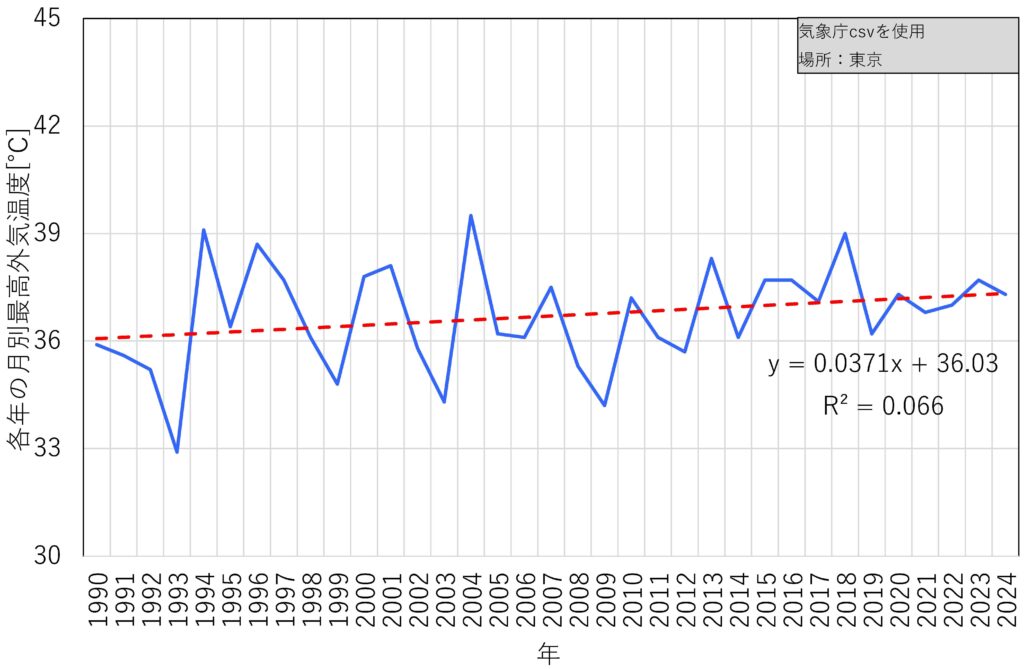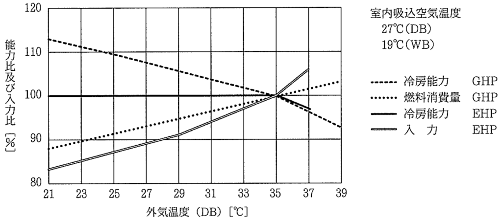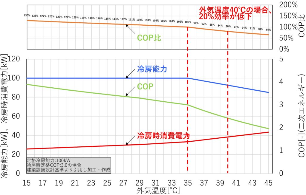 外気温度と電気熱源空冷ヒートポンプのCOPの関係 2025.12.21 こんにちは。年々外気温度が上昇する中で、冷房需要も増大しているのが現状である。そのため、あらかじめ冷房能力に余裕を持たせた空調機器を選定するケースも少なくない。しかし、外気温度の上昇に伴う電気式空冷ヒートポンプの効率低下を十分に考慮していない場合もあるだろう。本稿では、冷房運転時における外気温度と電気熱源空冷ヒートポンプのCOPの傾向について紹介する。 コンテンツ 外気温度の推移外気温度による冷房能力および消費電力、COPの推移外気温度による室外機の補正値外気温度の上昇に伴う冷房能力、消費電力、COP外気温度上昇による電気式空冷ヒートポンプ採用時の注意点まとめ 外気温度の推移 東京における各年の月別最高外気温度を下図に示す。決定係数は必ずしも高くはないが、年々外気温度が上昇している。そのため、一般的に外気温度が上昇するほど、空冷式の空調機器の効率が低下するため、外気温度を考慮して機器選定を行う必要がある。 外気温度による冷房能力および消費電力、COPの推移 外気温度による室外機の補正値 下図に外気温度による室外機の補正値を示す。前述したとおりだが、一般的に外気温度が上昇すると機器能力が低下する。また、外気温度の上昇により消費電力も増えるため、COPが低下する。 図:外気温度による室外機の補正値(出典:建築設備設計基準) 外気温度の上昇に伴う冷房能力、消費電力、COP 定格冷房能力を100kW、冷房時定格COPを3.0とし、建築設備設計基準に基づき、冷房能力と消費電力を補正した図を下図に示す。外気温度が35℃を超えると冷房能力が低下する。また、外気温度が上昇するほど、消費電力が上昇することがわかる。結果として、COPが低下する。例えば、外気温度35℃と外気温度40℃時における冷房能力を比較すると、冷房能力はおおむね10%程度低下することがわかる。また、消費電力は約30%程度増加する。結果として、COPは20%程度低下することが確認できる。 外気温度上昇に伴う各種パラメーターの推移 冷房能力 低下 消費電力 増加 COP 低下 外気温度上昇による電気式空冷ヒートポンプ採用時の注意点 外気温度上昇に伴う電気式空冷ヒートポンプ採用時の注意点を下表に示す。注意点は大きく二点あり、空調機器の効率の低下と消費電力量の増加が挙げられる。水冷式の場合は、外気温度の影響を受けづらい一方で、空冷式の場合は外気温度の上昇に伴い空調効率の低下が顕著である。また、効率が低下することにより消費電力量が増加し、電気代(ランニングコスト)が上昇する。さらに、外気温度が上昇することにより、同じ機器でも最大冷房能力が低下するため、より大きな空調機器を選定する必要があり、イニシャルコストが増加する。 外気温度上昇による電気式空冷ヒートポンプ採用時の注意点 効率の低下 空冷式は水冷式に比べて効率の低下が顕著 消費電力量の増加 効率低下に伴うランニングコストの上昇 空調設備容量の増加 冷房能力補正により空調設備容量の増強が必要 まとめ 本稿では、冷房運転時における外気温度と電気熱源空冷ヒートポンプのCOPの傾向について紹介した。今後も、外気温度が上昇することが想定されるため、長期的な目線も含めた空調計画が重要だろう。