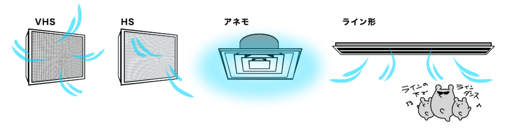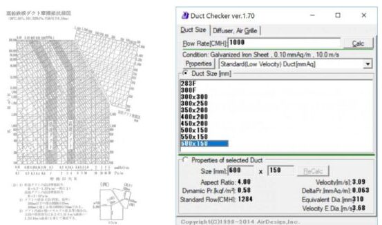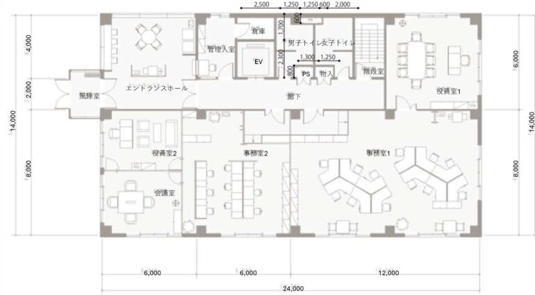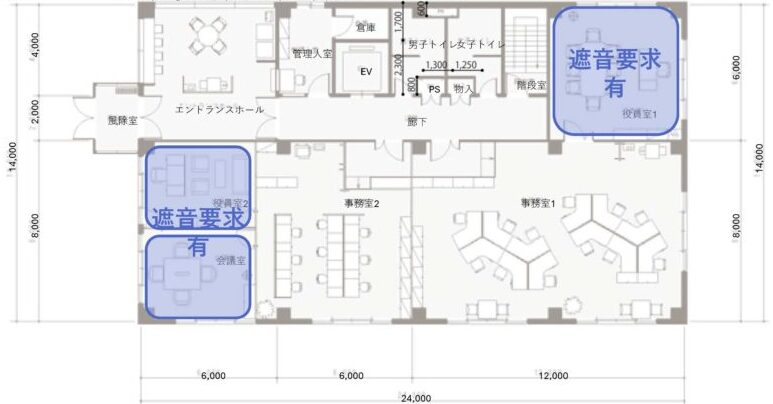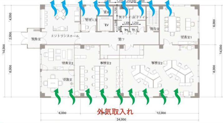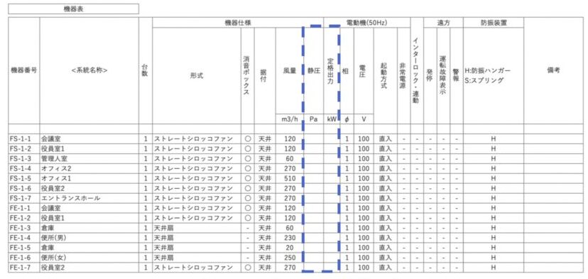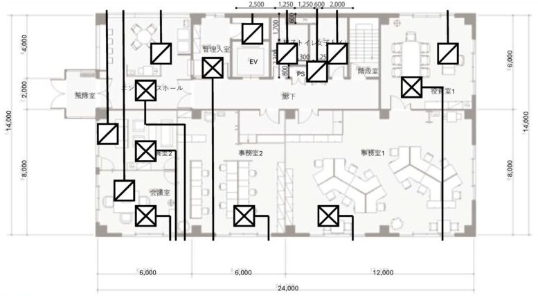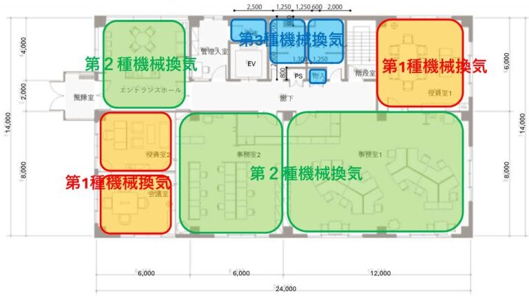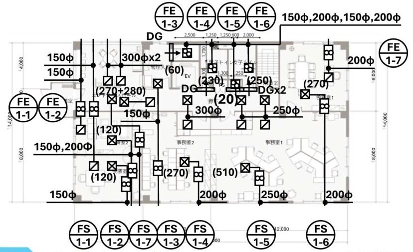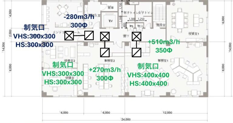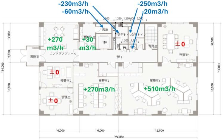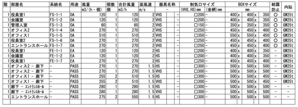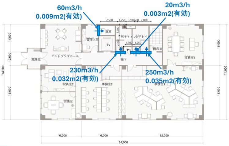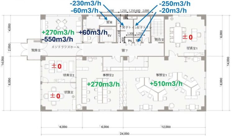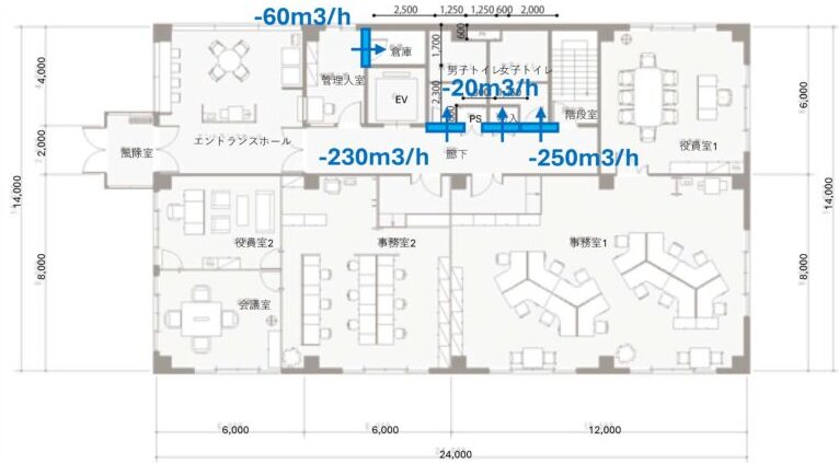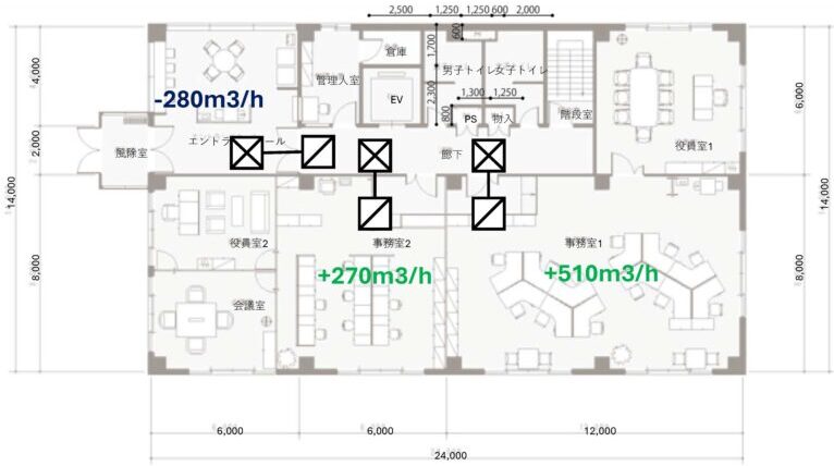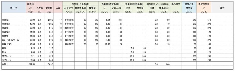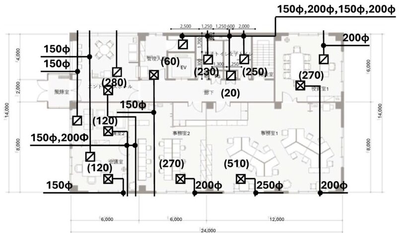 各室の換気量を平面図上で整理する。 例えば、平面図下部中央の事務室2の換気量は、室内レイアウトから席数が合計9席であるため、30m3/h・人 x 9席 = 270m3/hとなる。 また、平面図下部右側の事務室1は、席数が17席であるため、30m3/h・人 x 17席 = 510m3/hとなる。 そのほか、平面図上部中央の男子トイレは、室面積が8.21m2であり、天井高さは与条件より2.7mHであるため、8.21m2 x 2.7mH x 10回/h = 230m3/hとなる。 このようにして、各室の必要換気量を算定する。