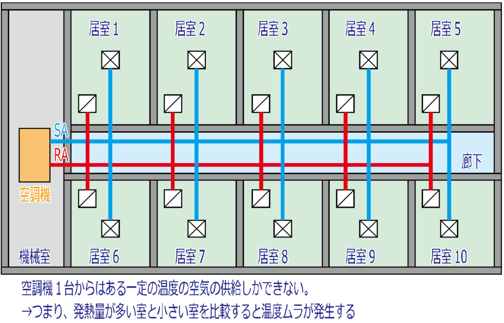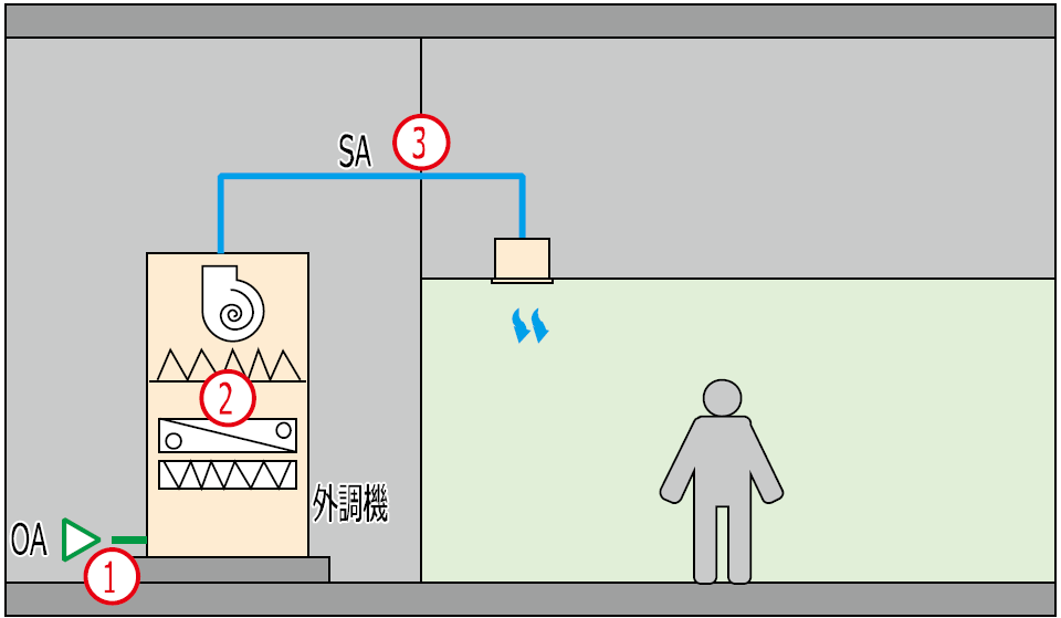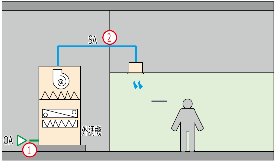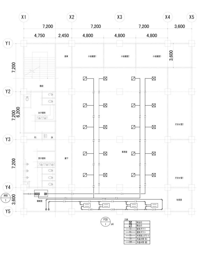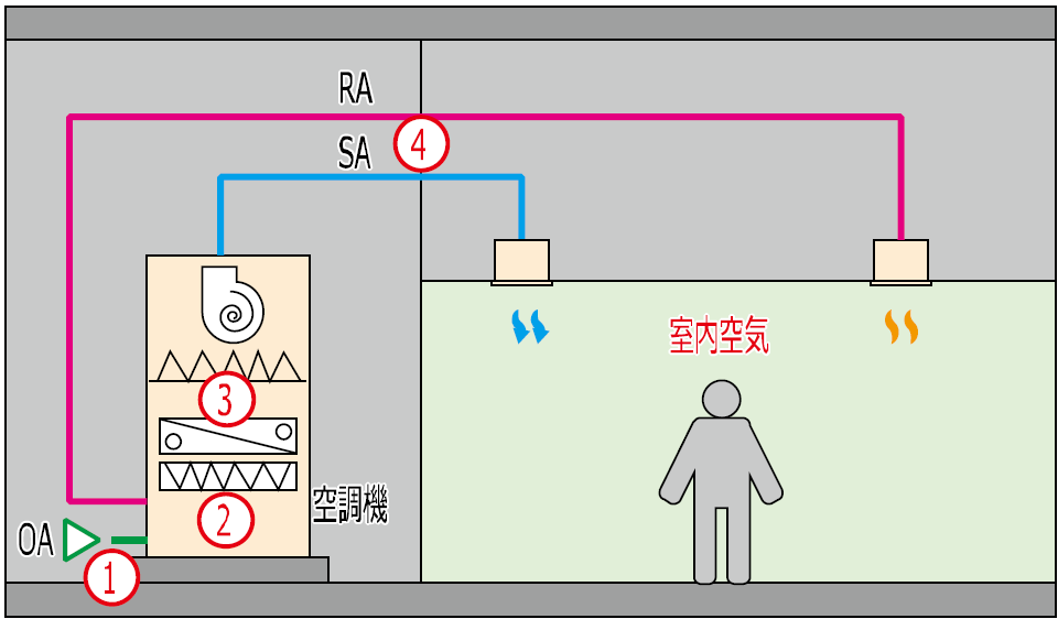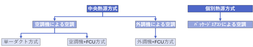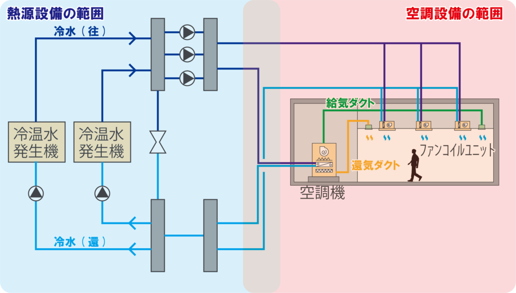 建築設備 -空調設備について紹介 2026.04.04 【↓機械設備入門一覧↓】(プルダウン) 機械設備入門 (10)【機械設備】 ・機械設備概要【空調換気設備】 ・換気設備概要 ・ダクト図 ・静圧計算 ・全熱交換器 ・スリーブ ・熱負荷計算 ・空気線図 ・熱源設備 ・空調設備 こんにちは。空調設備の設計をしていると、「空調方式が多すぎて、結局どれを選べばいいのか分からない」と感じることはないだろうか。実際、空調方式は非常に多様で、それぞれに特徴やメリット・デメリットがある。建物の用途や条件によって適正な空調方式が変わるため、検討すればするほど奥が深い分野である。しかし、それらの空調方式を検討するためには、空調設備の基本を熟知しておく必要がある。今回は、そんな空調設備の基本について紹介する。 コンテンツ 空調設備の概要熱源設備と空調設備の違い中央熱源方式における空調設備の範囲個別熱源方式(個別空調方式)における空調設備の範囲空調設備の分類空調設備の細分化各空調方式の特徴単一ダクト方式による空調計画例空調機+FCU方式による空調空調機単一ダクト方式と空調機+FCU方式の違い計画例外調機+FCU方式による空調計画例個別空調各空調方式の総括各空調方式と空気線図空調機による空調(夏期)空調機による空調(冬期)外調機による空調(夏期)外調機による空調(冬期)外調機による空調(冬期)個別空調(夏期)個別空調(冬期)まとめ 空調設備の概要 空調設備とは、部屋を冷やしたり暖めたりする設備を示す。例えば、冷房のときには冷風を、暖房のときには温風を供給する。空調設備の役割としては、人が快適に過ごせるように室内の温度や湿度をちょうどよく保つことである。例えば、夏に暑くなった部屋を冷やしたり、冬に寒い部屋を暖めたりするために、空調設備は欠かせない存在である。 空調設備の概要定義部屋を冷やしたり暖めたりする設備のこと。役割空調設備の役割としては、人が快適に過ごせるように室内の温度や湿度をちょうどよく保つこと。例えば、夏に暑くなった部屋を冷やしたり、冬に寒い部屋を暖めたりするために、空調設備は欠かせない存在である。 熱源設備と空調設備の違い 建物の設備は、大きく「熱源設備」と「空調設備」に分けられる。熱源方式は、ボイラーやチラーなどを使って冷水や温水といった「熱を運ぶための水(熱媒)」をつくる役割をもつ。これはいわば材料づくりの段階である。一方、空調設備は、その熱媒を受け取り、室内の空気を冷やしたり温めたりして、人が快適に過ごせる空気をつくる役割を担う。つまり、熱源が「熱を運ぶものをつくる装置」であるのに対し、空調設備は「その熱を利用して空気環境を整える装置」である。 熱源設備と空調設備の違い 熱源設備 ボイラーやチラーなどを使って冷水や温水といった「熱を運ぶための水(熱媒)」をつくる。 空調設備 空調設備は、その熱媒を受け取り、室内の空気を冷やしたり温めたりして、人が快適に過ごせる空気をつくる。 中央熱源方式における空調設備の範囲 熱源設備の範囲としては主に、熱源機器やポンプ類、それらをつなぐ配管類が該当する。一方で、空調設備の範囲としては主に空調機やファンコイルユニットといった室内の空調を直接的に担うものが該当する。熱源設備と空調設備は配管で接続されているが、熱源設備と空調設備の境界線についてはあいまいである。なお、中央熱源方式の場合は空調設備に換気設備が内包されている点も大きな特徴である。 個別熱源方式(個別空調方式)における空調設備の範囲 中央熱源の熱源機と同様に室外機も同じ役割を担っている。しかし、個別熱源方式の場合は室外機と室内機がセットで販売・設置される理由等から通例として室外機も含めて空調設備とされることが多い。そのため、個別熱源方式は個別空調方式と呼ばれることが多い。なお、個別熱源方式の場合は、別途換気設備を設置する必要がある。 空調設備の分類 空調設備は、求められる空気環境や温熱環境に応じて適切な方式を選択する必要がある。個別熱源方式(個別空調方式)は、一般的なオフィスビルで多く採用されているが、冷媒により空気を冷却・加熱する仕組みであるため、温度変化への追従性は必ずしも高くなく、さらに湿度制御も行えない。一方、中央熱源方式は水を用いて空気を冷却・加熱するため、温度環境への追従性は比較的高い。加えて、空調機や外気処理機により過冷却(除湿)、再熱、加湿などの処理を行うことも可能である。さらに、比較的大きな風量を一台の空調機で処理することができ、建物全体の空調に適している。 空調設備の分類 個別熱源方式(個別空調方式) 一般的なオフィスビルで多く採用される。 温度変化への追従性は高くなく、湿度制御を行うことができない。 中央熱源方式 温度環境への追従性が比較的高く、過冷却(除湿)、再熱、加湿などを行うことが可能。 また、大きな風量を一台の空調機で処理可能。 空調設備の細