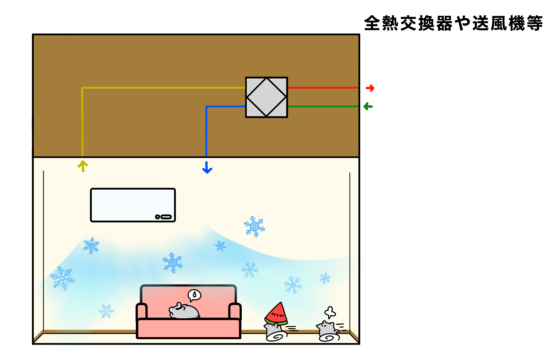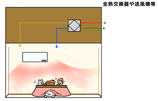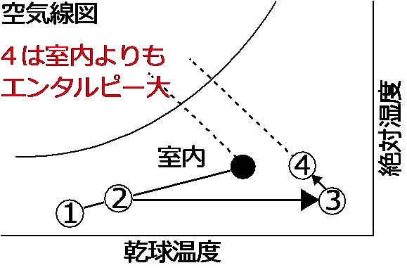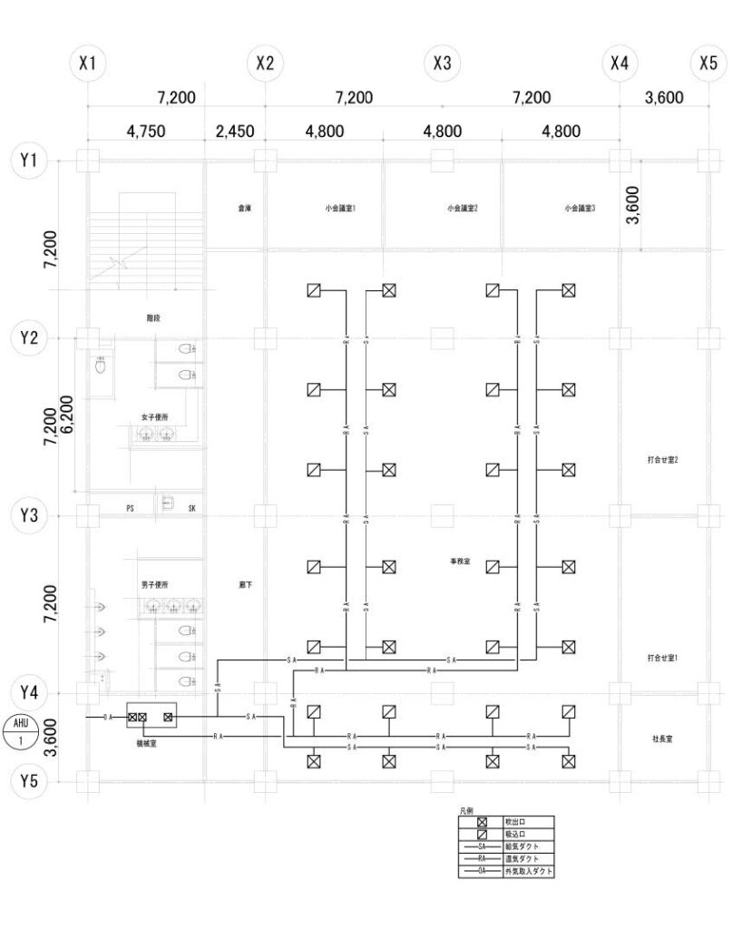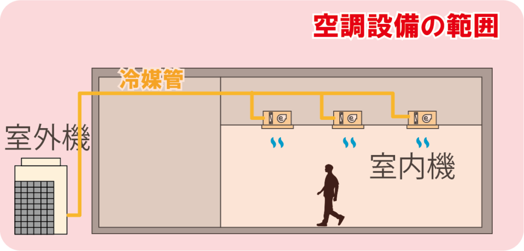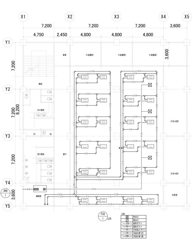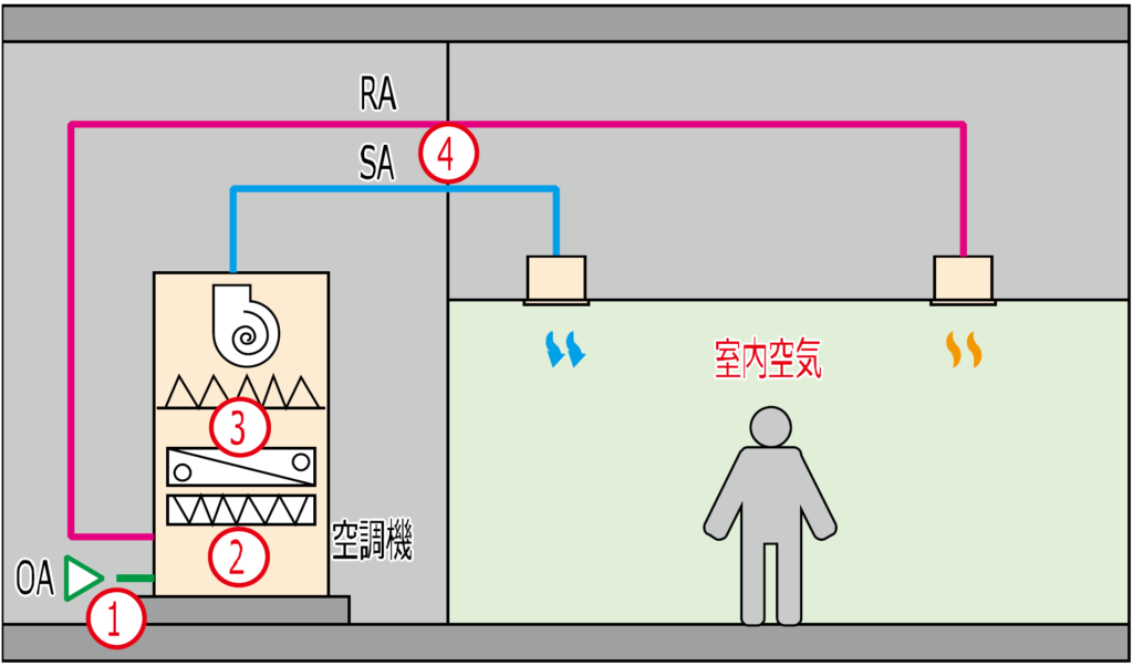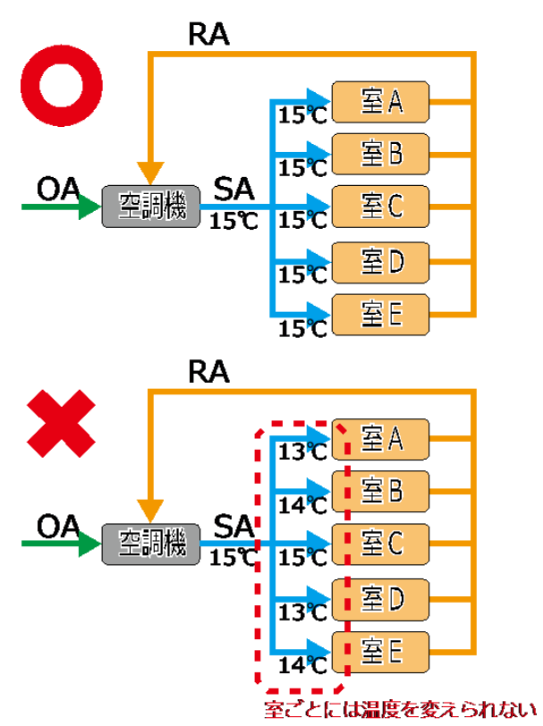 建築設備 -空調設備について紹介 2026.04.04 【↓機械設備入門一覧↓】(プルダウン) 機械設備入門 (10)【機械設備】 ・機械設備概要【空調換気設備】 ・換気設備概要 ・ダクト図 ・静圧計算 ・全熱交換器 ・スリーブ ・熱負荷計算 ・空気線図 ・熱源設備 ・空調設備 こんにちは。空調設備の設計をしていると、「空調方式が多すぎて、結局どれを選べばいいのか分からない」と感じることはないだろうか。実際、空調方式は非常に多様で、それぞれに特徴やメリット・デメリットがある。建物の用途や条件によって適正な空調方式が変わるため、検討すればするほど奥が深い分野である。しかし、それらの空調方式を検討するためには、空調設備の基本を熟知しておく必要がある。今回は、そんな空調設備の基本について紹介する。 コンテンツ 空調設備の概要熱源設備と空調設備の違い中央熱源方式における空調設備の範囲個別熱源方式(個別空調方式)における空調設備の範囲空調設備の分類空調設備の細分化各空調方式の特徴単一ダクト方式による空調計画例空調機+FCU方式による空調空調機単一ダクト方式と空調機+FCU方式の違い計画例外調機+FCU方式による空調計画例個別空調各空調方式の総括各空調方式と空気線図空調機による空調(夏期)空調機による空調(冬期)外調機による空調(夏期)外調機による空調(冬期)外調機による空調(冬期)個別空調(夏期)個別空調(冬期)まとめ 空調設備の概要 空調設備とは、部屋を冷やしたり暖めたりする設備を示す。例えば、冷房のときには冷風を、暖房のときには温風を供給する。空調設備の役割としては、人が快適に過ごせるように室内の温度や湿度をちょうどよく保つことである。例えば、夏に暑くなった部屋を冷やしたり、冬に寒い部屋を暖めたりするために、空調設備は欠かせない存在である。 空調設備の概要定義部屋を冷やしたり暖めたりする設備のこと。役割空調設備の役割としては、人が快適に過ごせるように室内の温度や湿度をちょうどよく保つこと。例えば、夏に暑くなった部屋を冷やしたり、冬に寒い部屋を暖めたりするために、空調設備は欠かせない存在である。 熱源設備と空調設備の違い 建物の設備は、大きく「熱源設備」と「空調設備」に分けられる。熱源方式は、ボイラーやチラーなどを使って冷水や温水といった「熱を運ぶための水(熱媒)」をつくる役割をもつ。これはいわば材料づくりの段階である。一方、空調設備は、その熱媒を受け取り、室内の空気を冷やしたり温めたりして、人が快適に過ごせる空気をつくる役割を担う。つまり、熱源が「熱を運ぶものをつくる装置」であるのに対し、空調設備は「その熱を利用して空気環境を整える装置」である。 熱源設備と空調設備の違い 熱源設備 ボイラーやチラーなどを使って冷水や温水といった「熱を運ぶための水(熱媒)」をつくる。 空調設備 空調設備は、その熱媒を受け取り、室内の空気を冷やしたり温めたりして、人が快適に過ごせる空気をつくる。 中央熱源方式における空調設備の範囲 熱源設備の範囲としては主に、熱源機器やポンプ類、それらをつなぐ配管類が該当する。一方で、空調設備の範囲としては主に空調機やファンコイルユニットといった室内の空調を直接的に担うものが該当する。熱源設備と空調設備は配管で接続されているが、熱源設備と空調設備の境界線についてはあいまいである。なお、中央熱源方式の場合は空調設備に換気設備が内包されている点も大きな特徴である。 個別熱源方式(個別空調方式)における空調設備の範囲 中央熱源の熱源機と同様に室外機も同じ役割を担っている。しかし、個別熱源方式の場合は室外機と室内機がセットで販売・設置される理由等から通例として室外機も含めて空調設備とされることが多い。そのため、個別熱源方式は個別空調方式と呼ばれることが多い。なお、個別熱源方式の場合は、別途換気設備を設置する必要がある。 空調設備の分類 空調設備は、求められる空気環境や温熱環境に応じて適切な方式を選択する必要がある。個別熱源方式(個別空調方式)は、一般的なオフィスビルで多く採用されているが、冷媒により空気を冷却・加熱する仕組みであるため、温度変化への追従性は必ずしも高くなく、さらに湿度制御も行えない。一方、中央熱源方式は水を用いて空気を冷却・加熱するため、温度環境への追従性は比較的高い。加えて、空調機や外気処理機により過冷却(除湿)、再熱、加湿などの処理を行うことも可能である。さらに、比較的大きな風量を一台の空調機で処理することができ、建物全体の空調に適している。 空調設備の分類 個別熱源方式(個別空調方式) 一般的なオフィスビルで多く採用される。 温度変化への追従性は高くなく、湿度制御を行うことができない。 中央熱源方式 温度環境への追従性が比較的高く、過冷却(除湿)、再熱、加湿などを行うことが可能。 また、大きな風量を一台の空調機で処理可能。 空調設備の細